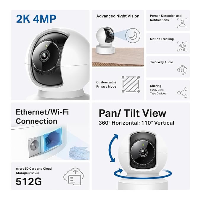 Tapo C222 2K QHD 1440p 4MP Pan/Tilt AI Smart Home Security Wi-Fi Camera| Works with Google Home and Alexa | 360º Ethernet/Wi-Fi Connection | Two-Way Audio| Advanced Night Vision